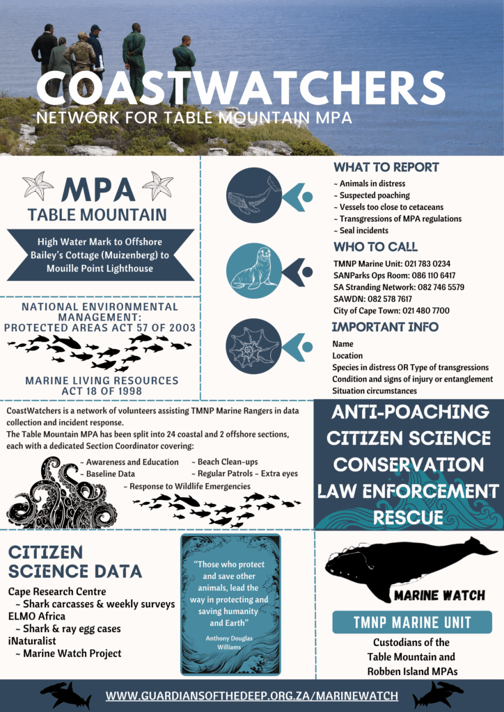 CoastWatchers is a result of local communities, organisations and SANParks Honorary Rangers uniting to support SANParks in their marine conservation duties for the Table Mountain and Robben Island MPAs